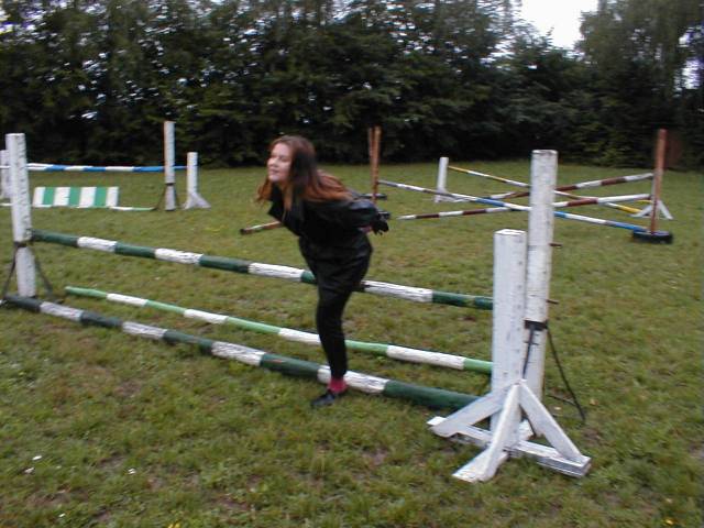 Scénka příjemně pokračovala, já si párkrát vyzkoušel i klus a jediné co jsem zkazil, byla lonž. Já totiž čekal, že po mně T. bude chtít nějaký ukázkový vysoký krok, odpoledne jsme se bavili o stylu obráceného gamma neboli L (jde sice o styl koníků na všech čtyřech, ale zajímal mě kvůli překladu ponyplay FAQu). Jenže vyčkával jsem, až mi něco takového přikáže. No a T. si zase myslel, že se budu chtít sám předvést. No nevadí, snad příště :o). Ale čas utekl jako voda a my jsme se museli vrátit :o(.