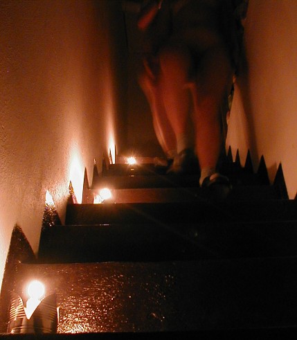 L: Odpolední siesta. Oba sedíme v křeslech a necháváme v klidu zažívat naše právě napucaná bříška. Zdánlivě se nic neděje, přesto oba víme, že to přijde. Povídáme si, slovně žertujeme, provokujeme se navzájem. A oba se těšíme. Čekej, dolehne k mým uším. Sedím, čekám ani malíčkem nepohnu: Odchází. Poskočí mi srdíčko radostí:půjdeme dolů! Ještě jednou se vrátí, aby mě ujistil, že přípravy trvají trochu déle a snad i proto, aby zkontroloval, jak plním příkaz. Směju se, mám tentokrát čisté svědomí, ani jsem se nepohla, ale ten prostředníček na pravé noze, ten mě teda svrbí. Za chvíli se vrací pro mě. Poznám to, jeho kroky jsou razantnější, spěchá. Ucítím trhnutí za obojek, nešikovně vstávám. Dostávám pásku přes oči a s kymácením a občasným zakopnutím se šinu kupředu. Prošli jsme dveřmi, na chviličku mi nadzvedne pásku. To, co vidím je úžasné, ohromující, jakoby mi spadl k nohám kus středověké nálady. T ale ví, čím mě potěší a zároveň i dostane...