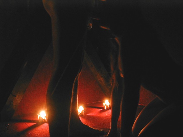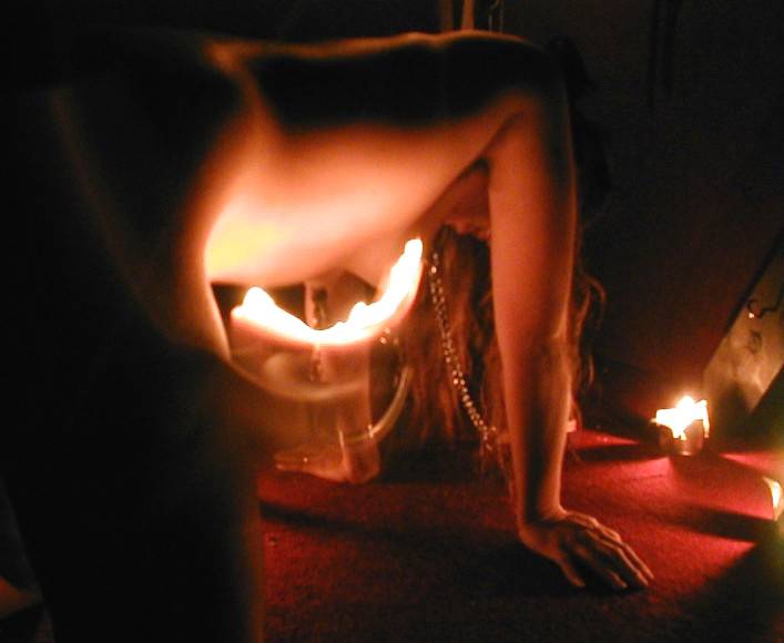 T: Kromě olizování různých částí partnerčina těla se její třes snažím omezit zahříváním kůže plameny svíčky :-) Pokud jste dost rychlí a přesní, může plamen svíčky zanechávat na těle černé stopy nespáleného vosku, přičemž chlupy někdy shořet stihnou, ale pokožka se nespálí. Plamen zanechává stopu i na fotografii (technické typy mohou z času expozice 0,5 s a délky stopy plamene vůči tělu odhadnout tu správnou :-) rychlost).