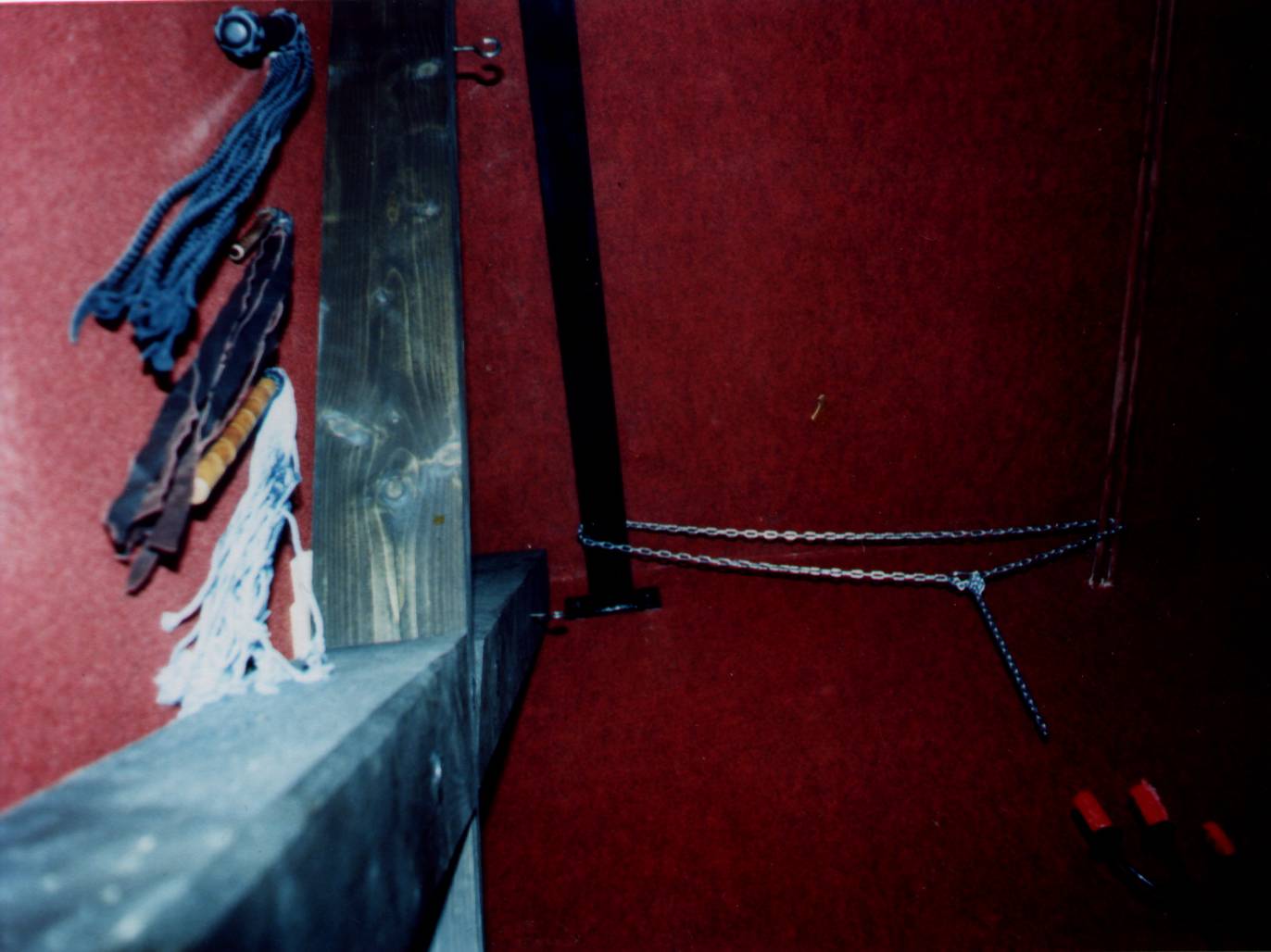Ještě jedna poznámka: popisovaný kříž je umístěn kolmo k zemi. Někdo doporučuje horní stranu kříže sklonit dozadu (tj. dolní část nohou umístit 30 – 50 cm od zdi), aby se dolejšek na kříž mohl částečně položit (při delším stání u něj). S touto úpravou jsem neexperimentoval, ale vzhledem k ceně materiálu se nad ní zamyslete, než se pustíte do práce na svém kříži (konce trámů by musely být seříznuty ještě šikmo, aby se trám opřel celou plochou o podlahu a strop , jak je vidět na obrázku a při zatížení se neviklal do stran. Kromě kotvení do zdi by trámy nejspíš musely být kotveny ještě na kolmou tyč zapuštěnou do podlahy a stropu nebo do objímek přišroubovaných k těmto plochám. Budete muset použít různé délky šroubů a spodek kříže ode zdi rozepřít vhodnými trámky.