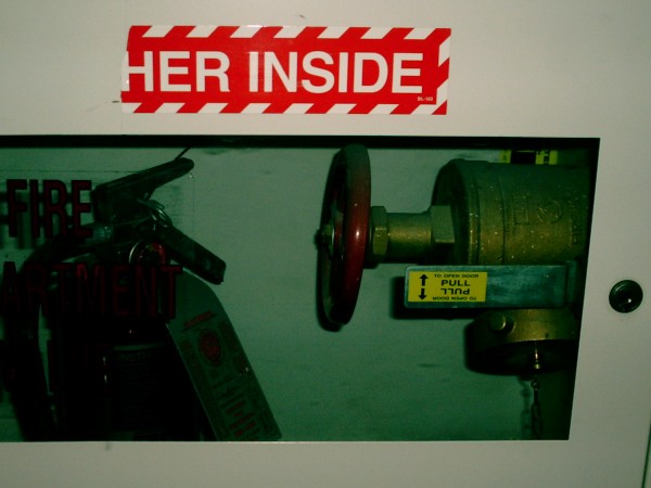 Americký humor - bývalo tam napsáno, že ve skříni je hasicí přístroj (fire extinguisher), ale teď nápis hlásá "co má uvnitř", "jsem v ní" (nebo "je zavřená uvnitř"? podle toho, která část bdsm vás víc zajímá :-)