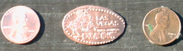 aneb kult osobnosti na jednocentové minci - zároveň je vidět, že z Vegas si můžete odnést suvenýr, na kterém portrét Otce zakladatele přeplácne reliéf tohoto Disneylandu pro velké děti (každé kasino má stroj na přerážení jednocentů, který minci zdeformuje a vyrazí na ni reklamu příslušného podniku) - na každém stroji je samozřejmě v duchu USA, kde je zákon na všechno, upozornění, že pozměňování mincí je federální delikt, ale tyto stroje mají zvláštní výjimku. Inu, země, kde zákony nejsou jen pro okrasu :-)