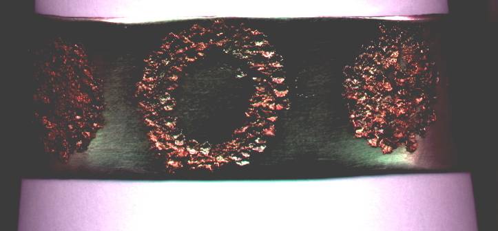 Pokud chcete na nerez nanášet měď, musíte si elektrodu ohřát, např. vytvořením pár jamek v barvě nerezu “za studena”. Když se vám konec elektrody rozžhaví do oranžova, ihned pokračujte v tvorbě dalších a dalších teček, které nyní budou mít barvu mědi. Pozor na to, že špička elektrody má teď teplotu 800 stupňů, CELÁ elektroda bude značně horká – pokud začne hořet to, v čem elektrodu držíte, pusťte to a uhaste. Foukáním plamen jen podporujete, protože materiál je ve styku s horkou elektrodou, která ho stále znovu a znovu zapaluje. I pokud nehoří, záleží na tom, v čem elektrodu držíte – v holé ruce nebo čemkoliv, co se taví (pozor na plasty – ošklivé spáleniny) určitě NE.