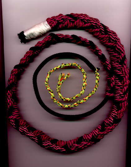 Pletení biče: šňůru si nastříhejte na kusy dlouhé 0.9, 1.5, 1.8, 2.1 a 2.7 metru. Pokud se šňůra při stříhání rozplétá, omotejte ji v místě plánovaného střihnutí předem izolepou nebo náplastí a pak stříhejte. Náplast můžete na koncích ponechat, na závěr pletení se konce stejně nesejdou přesně v jedné rovině, takže je budete muset odstřihnout. Pramen odélce 1.8 metru (budu mu říkat střední) si položte na zem a vyrovnejte. Další čtyři prameny přeložte napůl a jejich ustřihnuté konce vyrovnejte s jedním koncem středního pramene. Místa, v nichž jsou jednotlivé prameny přeloženy, by měla dosahovat do různých délek středního pramene - už byste měli vidět, jak se bič bude postupně zesilovat od špičky k držadlu. Bič vznikne tak, že celou délkou probíhá jeden pramen. Kousek od budoucí špičky biče začnete připlétat druhý pramen přeložený v půli, takže vlastně pletete ze tří pramenů. Po chvíli (když zjistíte, že jste dopletli do místa, kdy je zbytek středního pramene stejně dlouhý, jako zatím nepoužitý přeložený kus šňůry, který má přijít na řadu) přidáte další pramen přeložený v půli, takže pletete z původního pramene, ke kterému přiložíte levou půlku druhého přídavku (tj. zacházíte se dvěma kusy šňůry jako s jedním pramenem), z levé půlky prvního přídavku, k níž přiložíte pravou půlku druhého přídavku (opět dva kusy šňůry jako jeden pramen) a z pravé půlky prvního přídavku. Pletete tedy 2+2+1 šňůru dohromady. Po chvíli přidáte další pramen přeložený napůl, tj. pletete 2+3+2, pak 3+3+3, a to je konec.Z původní tloušťky jedné šnůry je bič najednou 9xsilnější. U držadla se Vám konce šňůr určitě nesejdou, to je normální, takže držadlo v délce 6-8 cm omotejte náplastí nebo kobercovkou, kterou pevně utáhnete, a přečnívající konce šňůr odstřihněte. Pokud se šňůry rozplétají, namočte je do lepidla nebo barvy nebo zatavte nad svíčkou, ale nutné to není, držadlo je nejméně namáhanou částí biče. Špičku biče ještě ztenčíte tím, že z původního pramene, který by měl sahat asi 40 cm nad místo,kde k němu byl přidán první přídavek, shrnete opletení v délce asi 20 cm a přečnívající "duši" odstřihnete. Pak opletení přehrnete zpět a konec duše zatavíte nad plamenem. Na špičku biče (zatím nepráská, nezkoušejte si vykloubit rameno) připevněte zmíněný metrový kus slabší šňůry. Přeložte ji v polovině, přivažte ji za střed na špičku biče a co nejpevněji utáhněte (stačí jeden obyčejný uzel, práskání biče jej stále utahuje, jde vám jen o prvotní fixaci na správném místě). Špička překračuje zvukovou bariéru, při tréninku venku se rychle opotřebovává a musí se občas vyměnit. Takže žádné lepidlo, jen uzel, utažený "na krev". Výměna této šňůry se provádí opatrným rozříznutím uzlu žiletkou, abyste nepoškodili silnější špičku zapletenou do biče. Když máte šňůru v polovině uvázanou na špičku pletené části biče, vezměte její konce a položte je ve směru prodloužení biče. Teď musíte oba konce vzít mezi prsty a začít je stáčet jedním směrem (neomotávat jeden kolem druhého, jen s oběma točit na jednu stranu, aby se každý z nich vypnul a ztuhnul). Pokud máte šnůru pletenou, je jedno, na kterou stranu točíte. Pokud je stočená (kroucená), točte tak, abyste původní stočení utahovali. Když je šňůra dost napnutá (nepřežeňte to, nesmí se dělat uzlíky), udělejte asi 4 cm od volných konců, které jste stáčeli, uzel (opět ten nejjednodušší uzel utažený přes oba paralelně držené konce šňůry). Když pak konce pustíte, měly by se kolem sebe samy volně omotat v opačném směru, než jak jste oba konce šnůry utahovali.