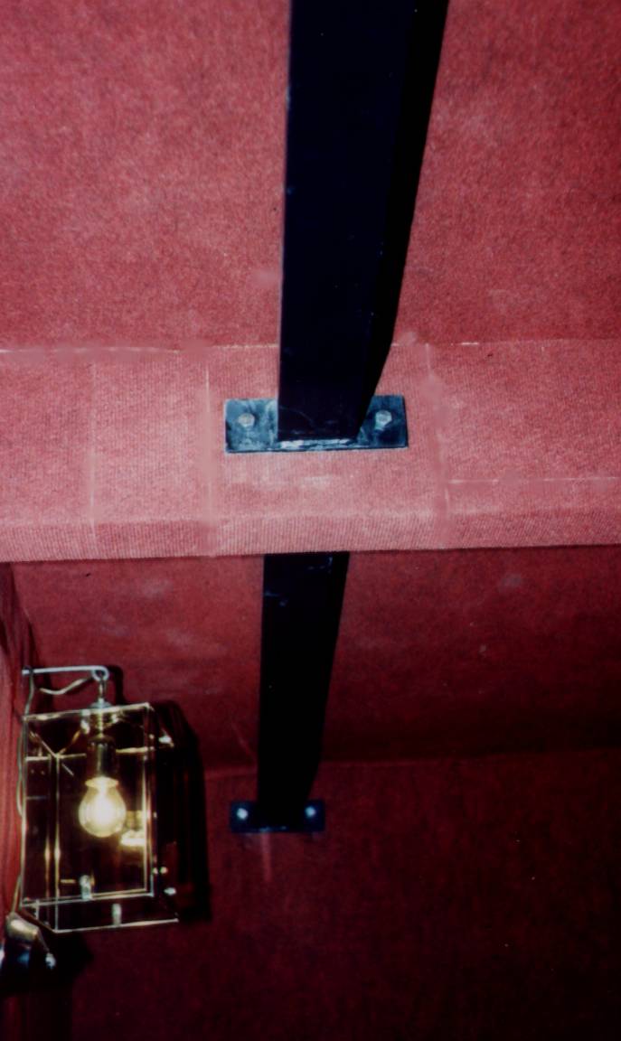 Při návrhu jsem vycházel z podmínek v mučírně, tj. rozměr místnosti 2,50 x 2,90 m s tím, že uprostřed stropu běží traverza (přechod dvou hrazd v levé části mučírny před traverzu umístěnou ve středu stropu je vidět zde, poloha hrazd pod stropem v přední části místnosti je vidět zde). Traverzy lze využít ke zkrácení rozporu hrazd a snížení jejich potřebného průřezu (roste s druhou mocninou rozporu, tj. vzdálenosti krajů hrazdy, ale neberte mě za slovo, nejsem statik). Při instalaci v běžné místnosti (rozpor 3,5 metru) bych si nebyl jist, zda se traverzy nebudou prohýbat. Pravděpodobně ano, menší průhyb (do 1 cm na délce 3,5 m) by nemusel vadit. Otázkou taky je, zda by stačilo níže popsané ukotvení do zdi.
