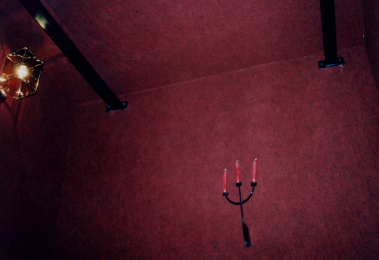 K dotvoření ponuré gotické atmosféry jsem navrhl jednoduchý svícen. K výrobě nepotřebujete žádné zvláštní vybavení, kromě svářečky. Svícen je vyroben z ocelové kulatiny (lidově "hlazenka") průměru 5 mm, která je (v ruce s pomocí svěráku) ohnuta do oblouku (svícny jsem vyráběl dva a s výhodou využil kontroly dokonalosti ohnutí proti papírové šabloně a též jednoho oblouku proti druhému). Oblouk se pak v polovině rozřízne a konce přivaří k rovné tyčce. Máte-li autogen, můžete na horní konce kulatinek přivařit ocelové jehly, které drží svíčky. Pokud sváříte elektřinou, nemáte nic slabšího než 2 mm šanci přivařit a musíte tedy na kusech kulatiny (před ohnutím kulatiny do oblouku!) vybrousit na brusce špice. Pod špice přivařte (to jde i elektrickou svářečkou, i když asi nelze mluvit o svaru, spíš o kapce kovu) plechová kolečka o průměru 4 cm, do nichž vyvrtáte otvor 5 mm-