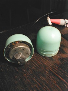 Spodek vajíčka (já mám motorek v menší polovině, větší motorek by nejspíš bylo vhodné dát do větší z obou polovin) nůžkami propíchnete, díru kruhovým pohybem nůžek zvětšíte, protáhnete skrz tenký stíněný kabel (vydrží dost v tahu a hned se nepřeskřípe), jeden pól napájení můžete vést opletením kabelu, druhý vnitřními žilami (nebo volné žíly využít např. k vedení proudu do vaginálních elektrod, které lze nalepit na povrch vajíčka, nebo zapustit do jeho stěny - to přijde za chvíli :-). Nakabelu rozhodně udělejte uzel (uvnitř vajíčka, tak centimetr od konce kabelu), pokud ho nemůžete zajistit proti vytržení nějak lépe - svorkou.