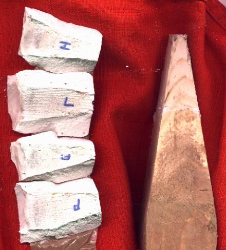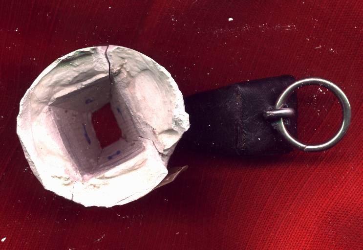 Závažíčko odlijete do formy. Forma se nejlépe vyrábí ze sádry (koupíte v drogerii). Potřebujete model závažíčka, který jsem zhotovil ze dřeva. Na prvnim obrázku je sádrová forma vidět rozložená (je ve tvaru jehlanu,takže na obrázku vidíte čtyři stěny) - vlevo, spolu s dřevěným modelem závažíčka - vpravo. Nadruhém obrázku vidíte formu shora, spolu s hotovým závažíčkem, již opatřeným háčkem s okem.